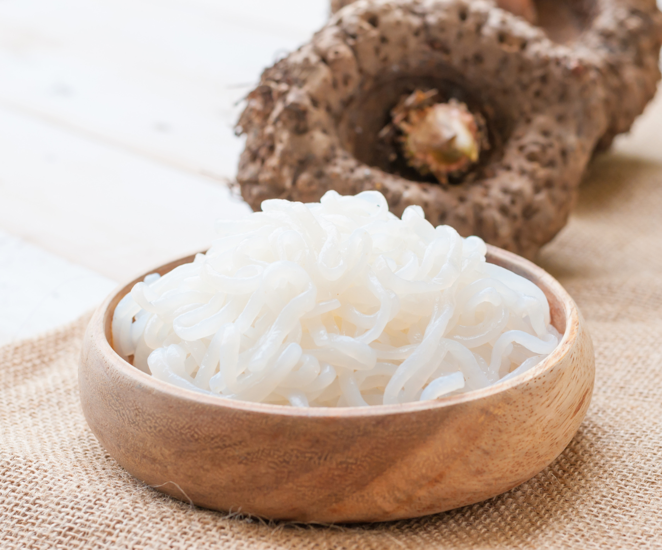 Die Konjakwurzel enthält Glucomannan, eine lösliche Ballaststoffart, die Wasser bindet und im Magen aufquillt. Dadurch entsteht ein Sättigungsgefühl und die Nahrungsaufnahme wird reduziert.