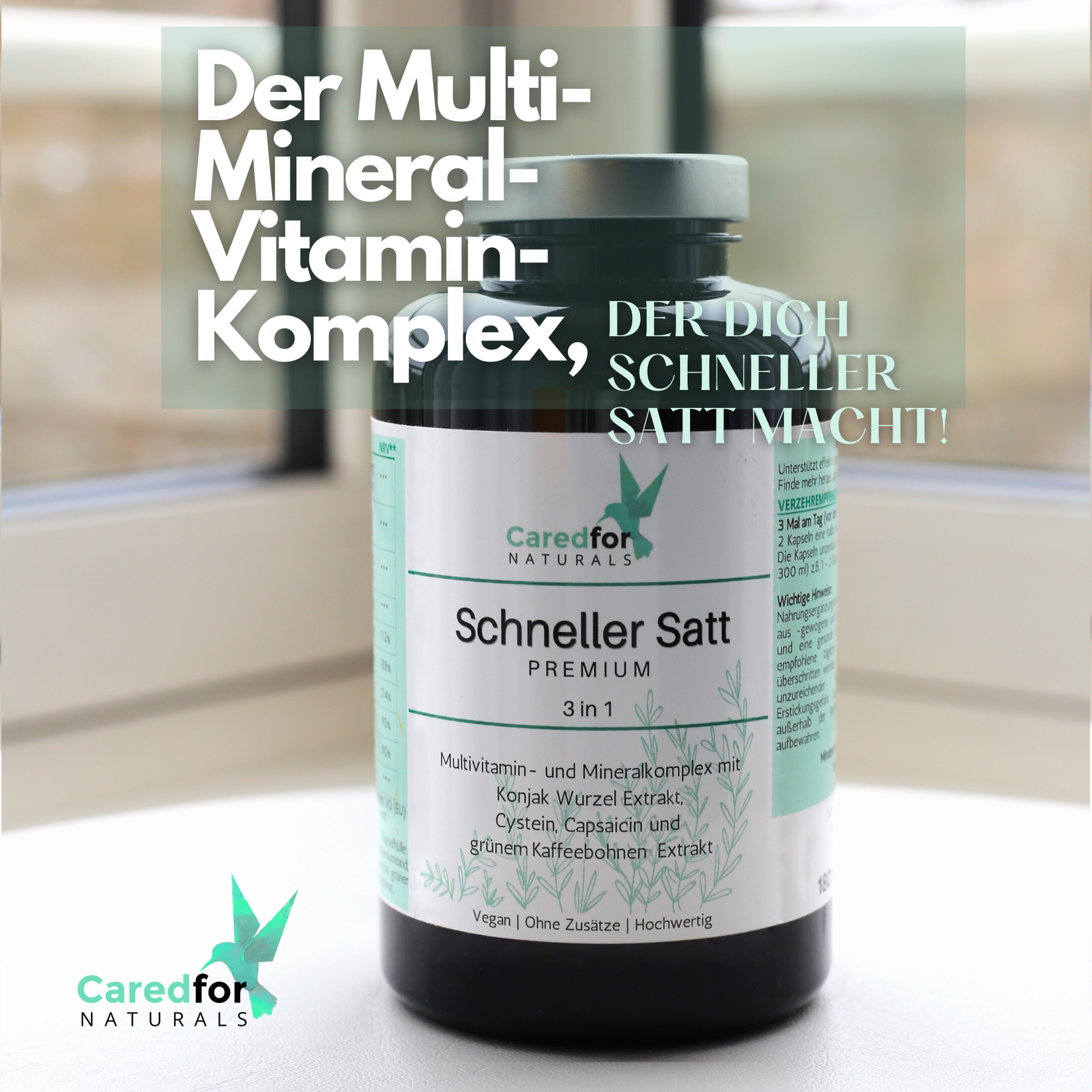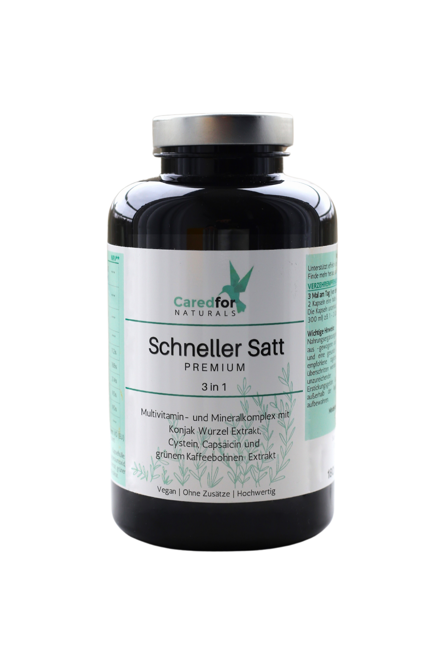 Schneller Satt 3-in-1 Premium. Es ist ein Multivitamin- und Mineralienkomplex, der hochwertige Zutaten beinhaltet (Konjakwurzel, Cystein, Capsaicin, grüne Kaffeebohne), der das Abnehmen bei einer kalorienarmen Diät effektiv unterstützt.